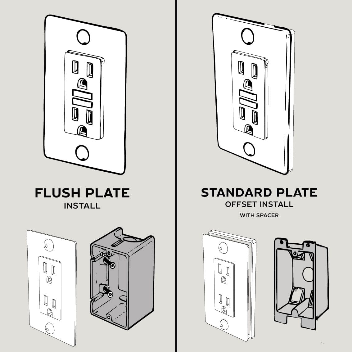 Every plate ships with a spacer, giving you the flexibility to install flush to the wall or raised by 3/16" — enough to sit cleanly over a projecting electrical box, so nothing peeks out behind the plate. No adaptors to source, no guesswork. Just a clean result however your walls are wired.